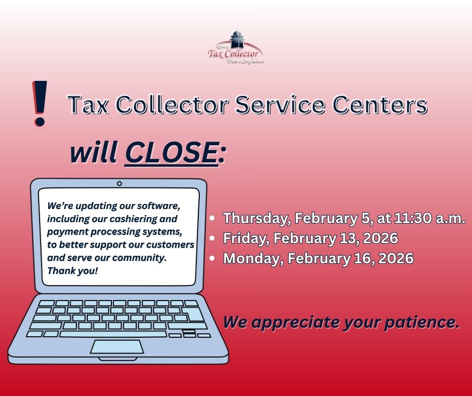- Tax Collector locations will be closed Friday, February 13, and Monday, February 16.